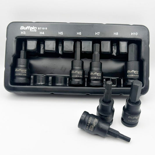 Buffalo Tools 7pcs 3/8 inch Hex Impact Socket Bit Set H3-H10 Allen Key, Durable Vanadium Steel, Rust Resistant Finish, 2mm-10mm Tool Set with Storage Tray